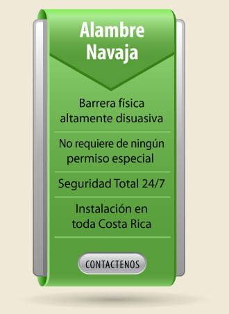 Alambre NavajaOfrecemos instalación de Alambre de Navaja en acero inoxidable y en hierro galvanizado, remodelación y mantenimiento de seguridad perimetral en cualquier lugar en Costa Rica. Nuestros productos cuentan con altos estánderes internacionales. Ofrecemos:18" y 24" Helical en Galvanizado o Acero Inoxidable Características:• Acero Inoxidable: AISI 430 Estilos:• Helical |